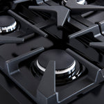 - Continuous cast-iron grates deliver even heat, ensuring stable cookware placement and smooth movement across the cooktop.
