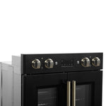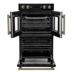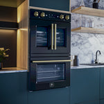 The Forno Asti 30” Double Wall Oven in black with anitque brass accessories combines elegance and performance with a French-door top oven for effortless, one-handed access. Featuring 7.36 cu. ft. of true convection cooking, it ensures even heat distribution for perfect baking results. The built-in air-fry function delivers crispy textures with minimal oil, while precision control knobs provide a hands-on approach to cooking. A digital LED display offers seamless management of the timer and Sous Vide function, enhancing precision and versatility. Designed for convenience, the self-cleaning mode simplifies maintenance, keeping your oven spotless with minimal effort.