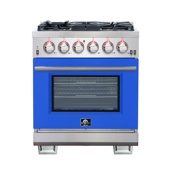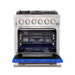 The Forno Capriasca 30 Inch Gas Range enhances your home kitchen with professional styling and performance through its durable and beautiful 304-grade stainless-steel design with blue door. The cooking surface features 5 sealed dual-ring brass burners, totaling 100,000 BTU. All burners, each at 20,000 BTU, can simmer precisely at 1,000 BTU. Continuous heavy-duty cast-iron grates facilitate easy sliding of pots or pans off heat over the enamel cooktop cavity, simplifying spill cleanup. The 4.32 cu. ft. gas oven, with a 30,000 BTU output and infrared red mesh broiler, enclosed in a blue enamel interior, offers optional convection for precise, and consistent cooking on multiple levels. For convenient viewing, a 3-layer glass oven door window is included. The package includes 3 telescopic stainless-steel oven racks, wok support, and an LP conversion kit. Additionally, zinc-coated illuminated metal knobs with bezel rings ensure enduring beauty.
