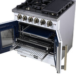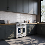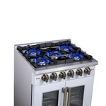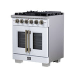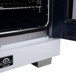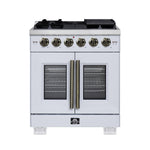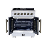 The 30 Inch Forno Capriasca French Door Gas Range blends professional style and durability with its white finish design. Featuring unique french doors for extra oven access space, a rangetop delivering 100,000 BTU with 5 dual-ring brass burners, and heavy-duty cast iron grates over a recessed enamel cooking surface for easy cleaning. The 4.32 cu. ft. gas oven with 30,000 BTU output, convection fan, and 3-layer glass oven door window ensures precision cooking. Includes a LP conversion kit, 3 telescopic oven racks, wok-ring, reversible griddle, rotisserie kit, air fry basket and drip pan. Zinc-coated metal knobs with bezel rings add a touch of elegance.