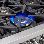 The Forno Capriasca 36-Inch french door dual fuel range harmonizes professional styling and performance into your home kitchen with its durable stainless-steel design. Unique french doors mean open doors allow up to 12 Inch of more space to access your oven. The gas rangetop has 6 sealed dual-ring brass burners with a total output of 120,000 BTU for simmering melting chocolate or simmering sauces. The heavy-duty continuous cast iron grates allow maximum stability of cookware and mobility over a recessed enamel Cooking Surface cavity which keeps spills and splashes contained and easy to clean. The 5.36 cu. ft. true convection oven with a total output of 6,300 Watts is encased in a speckled blue enamel interior, ensures fast, precise and consistent cooking along for easy viewing is a 3-layer glass oven door window. Included is an LP conversion kit, 3 stainless steel telescopic oven racks, wok support, reversible griddle, rotisserie kit and skewers forks, air fry basket with rack and drip pan. Additionally, zinc coated metal knobs with bezel rings will maintain their beauty for years.