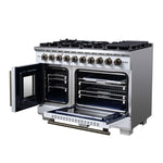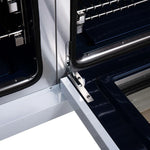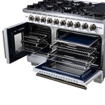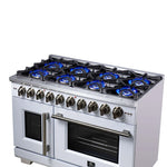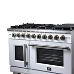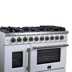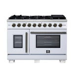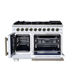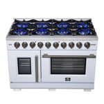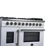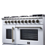 The Forno Capriasca 48 Inch in White French Door Gas Range enhances your home kitchen with professional styling and performance through its durable and beautiful design. The cooking surface features 8 sealed dual-ring brass burners, totaling 160,000 BTU. All burners, each at 20,000 BTU, can simmer precisely at 1,000 BTU. Continuous heavy-duty cast-iron grates facilitate easy sliding of pots or pans off heat over the enamel cooktop cavity, simplifying spill cleanup. The 6.58 cu. ft. double ovens, with a 44,000 BTU output, are enclosed in a blue enamel interior. The 4.32 cu.ft. main oven offers a powerful 10,000 BTU infrared mesh broiler, a rotisserie skewer and a convection fan for precise, and consistent cooking on multiple levels. The package includes 6 telescopic stainless-steel oven racks, 1 rotisserie kit, wok support, griddle, air-fryer kit and an LP conversion kit. Additionally, zinc-coated illuminated metal knobs with bezel rings ensure enduring beauty.
