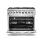 The Galiano 36" Dual Fuel Range blends professional style and performance with a durable stainless steel design. Featuring six sealed burners with a total output of 83,000 BTU, including a powerful 20K dual-ring burner for boiling or searing, it gently simmers delicate foods, such as chocolate and sauces. The cast iron grates provide stability and smooth pan sliding, while the 5.26 cu. ft. electric oven delivers 6,300 watts of power, making it perfect for baking, roasting, and broiling with true convection options. Included are two oven racks, an LP conversion kit, and elegant zinc-coated metal knobs with bezel rings that retain their beauty.