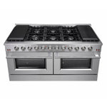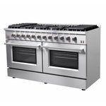 The Forno Galiano 60" Gas Range combines professional-grade performance with sleek stainless steel durability. The cooktop features 10 sealed burners with a total output of 142,000 BTU, including two 20,000 BTU dual-ring burners that can simmer at 1,000 BTU. Our cast iron grates ensure cookware stability and effortless movement between burners. Two convection ovens have a total capacity of 8.64 cu. ft. and delivers a total of 30,000 BTU for broiling and baking. Both ovens feature a sleek black enamel interior and a three-layer tempered glass door for superior heat retention and clear visibility. Additional features include 2 reversible griddles, an LP conversion kit, an air-fryer kit with a drip pan and durable zinc-coated knobs with bezel rings, built to maintain their beauty. Backed by Forno's 2-year warranty, this range offers peace of mind, lasting performance, and exceptional affordability.
