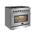 The Massimo 30 Inch Dual Fuel Range delivers professional style and durability to your home kitchen with its robust stainless-steel design. The cooktop features 5 sealed burners, 68,000 BTU output which one is a 20,000 BTU dual-ring burner that can reach a simmer of 1,000 BTU for precise simmering. Continuous cast iron grates ensure stability over the enamel cooktop cavity, containing spills for easy cleaning. The 4.32 cu.ft. true convection fan oven boasts a blue enamel interior, making cleaning a breeze. The 3-layer glass oven door window retains heat and provides a clear view. With a powerful 6,300 Watts output, this oven excels in baking, roasting, and broiling. Included are 2 telescopic oven racks, wok support, griddle, air-fryer kit with drip pan, a NEMA 14-50P power cord and an LP conversion kit. Housed in a high-grade stainless steel body with illuminated zinc knobs, the Massimo offers a stylish, long-lasting addition to your kitchen