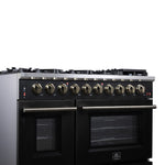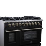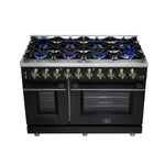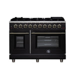 The Forno Massimo 48 Inch Gas Range in Black harmonizes professional style and durability with Antique Brass. Its 8 sealed burners, totaling 107,000 BTU, include a precision 20,000 BTU dual-ring burner that can simmer at 1,000 BTU. Continuous cast iron grates ensure stability on the enamel surface. The main oven of 4.32 Cu.Ft has a convection fan with 30,000 BTU Total Broil and Bake output. The secondary oven has a capacity of 2.26 Cu.Ft. with a 14,000 BTU Bake output. Both ovens have an impressive blue enamel interiors allowing for easy cleaning and 3-layer glass oven door window provides both heat retention and an unobstructed view. It features 2 telescopic racks per oven, an air fryer kit, a wok support, two reversible griddle, an LP conversion kit, and durable zinc-coated metal knobs. Elevate your kitchen with performance, convenience, and enduring elegance.