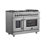 Introducing the Massimo 48 Inch French Door Dual Fuel Range, expertly combining professional style and durability in your home kitchen with its robust stainless-steel construction. The rangetop boasts eight sealed burners, delivering a total of 107,000 BTU, including a 20,000 BTU dual-ring brass burner that achieves a precise 1,000 BTU simmer. Continuous cast iron grates offer stability and contain spills on the enamel cooktop for easy cleaning. The ovens provide a combined capacity of 6.58 cu.ft. and a total power output of 9,700 Watts, suitable for baking, roasting, and broiling. The interiors feature impressive blue enamel for easy maintenance, and the three-layer glass oven doors ensure heat retention and visibility. The main oven includes a true convection fan. Accessories include four telescopic oven racks, wok support, two griddles, an air-fryer kit with drip pan, a NEMA 14-50P power cord, and an LP conversion kit. The high-grade stainless steel body and illuminated zinc knobs make the Massimo a stylish, lasting addition to your kitchen.