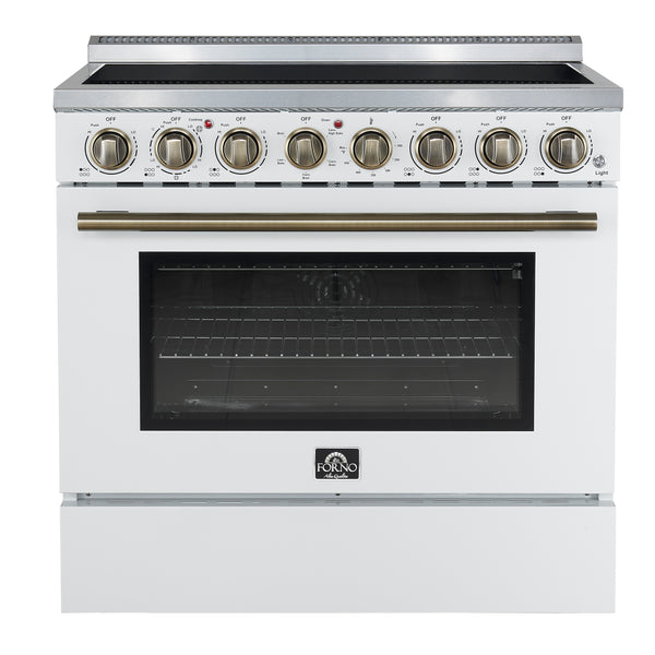 The Forno Paolo 36 Inch electric range in white with antique brass knobs and handles combines power and style for the modern kitchen. Its smooth ceramic glass cooktop features five radiant elements with 9,800 watts of total output. The 5.44 cu. ft. true convection oven delivers fast, even results with a 1,200-watt fan and 3,000-watt high-powered baking and broiling elements. A hidden bake element, bright halogen lights, and a large viewing window add convenience. This freestanding electric range also includes a 100-watt warming zone and dual-element broiler for precise, high-heat cooking.