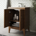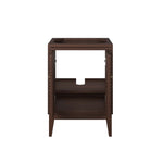 Mid-century style inspired the modern look of the Ledger 24" Bathroom Vanity Cabinet. With square brass hardware, this vanity is made with solid mindi wood and showcases a beautifully carved linear design that adds intrigue and interest. Resting on tapered legs, the Ledger Vanity Cabinet features a spacious storage area behind two soft-close hinged doors perfect for concealing all your bathroom essentials. Blending style and function, it boasts an adjustable shelf complete with a convenient cut-out to accommodate plumbing. Sink basin and fixtures not included. Weight Capacity: 187 lbs.