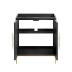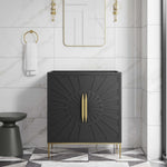 Intricate modernity radiates into your bathroom space with the Awaken 30" Bathroom Vanity Cabinet. Showcasing clean lines arranged in a radial formation, this bathroom vanity is crafted with solid wood and MDF and rests on a gold base with non-marking foot pads to protect flooring. Offering ample storage space for bathroom essentials and more, this vanity cabinet features spacious shelves hidden behind detailed doors with sleek gold hardware. Sink basin and fixtures not included. Assembly required.