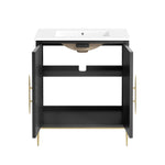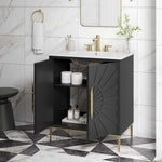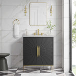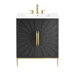 Intricate modernity radiates into your bathroom space with the Awaken 30" Bathroom Vanity. Showcasing clean lines arranged in a radial formation, this bathroom vanity is crafted with solid wood and MDF and rests on a gold base with non-marking foot pads to protect flooring. This vanity is a complete addition to a bathroom with a ceramic sink basin with an integrated countertop and 8" widespread holes. Offering ample storage space for bathroom essentials and more, this vanity cabinet features spacious shelves hidden behind detailed doors with sleek gold hardware. Fixtures not included. Assembly required.
