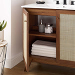 Introduce refreshing style to your restroom with the Soma 36" Bathroom Vanity Cabinet. Showcasing a beautiful rattan weave on the cupboard doors, this vanity cabinet brings organic aesthetics and modern functionality to any bathroom or powder room. Crafted from durable MDF and particleboard with a natural wood grain finish, this cabinet features an adjustable shelf, providing easy customization for arranging towels, toiletries, and bathroom necessities. Complete with metal doorknobs with a brushed gold finish and soft-close hinges, this bathroom vanity cabinet is designed for quiet and effortless functionality. Resting on splayed legs, the Soma Bathroom Vanity includes non-marking foot caps to protect flooring. Assembly required. Fixtures and sink basin not included. Weight Capacity: 200 lbs.