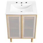Elevate your bathroom space with the Calla 24" Bathroom Vanity, where contemporary design meets everyday practicality. This single bathroom vanity features a durable particleboard construction with a smooth laminate finish that adds a modern touch to your bathroom decor. The unique perforated metal door fronts of this bathroom sink cabinet offer a stylish update while concealing ample storage space for all your bathroom essentials. This small space vanity is customizable with its adjustable shelf, designed to accommodate your plumbing needs with ease. The push-to-open doors and sleek dowel legs highlight its minimalist design, while the bathroom cabinet's non-marking, adjustable foot levelers protect your flooring. A high-quality ceramic sink basin with 8" widespread holes completes the look, ready for faucet installation (not included). The Calla vanity sink requires simple assembly, with clear instructions to guide you through the setup. Fixtures not included.