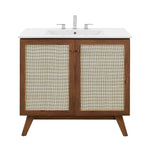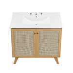 Introduce refreshing style to your restroom with the Soma 36" Bathroom Vanity. Showcasing a beautiful rattan weave on the cupboard doors, this vanity brings organic aesthetics and modern functionality to any bathroom or powder room. Crafted from durable MDF and particleboard with a natural wood grain finish, this vanity boasts a ceramic sink basin with 8-inch widespread holes and an integrated countertop. This vanity features an adjustable shelf, providing easy customization for arranging towels, toiletries, and bathroom necessities. Complete with metal doorknobs with a brushed gold finish and soft-close hinges, this bathroom vanity cabinet is designed for quiet and effortless functionality. Resting on splayed legs, the Soma Bathroom Vanity includes non-marking foot caps to protect flooring. Assembly required. Fixtures not included.
