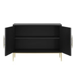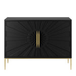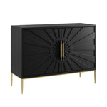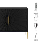 The Awaken 47" Accent Cabinet brings intricate modernity to your space. Featuring clean lines in a radial formation, this wide storage cabinet is crafted from wood veneer and rests on a sleek gold base with non-marking foot pads to protect your floors. The doors showcase a striking sunburst design, with radiating lines that form a dynamic and visually captivating pattern. Accentuated by gold hardware, this piece offers four large cubbies with two adjustable shelves perfect for storing linens, home décor, silverware, barware, and more. Ideal for the hallway, entryway, or living room, this two-door cabinet combines functionality with style. Assembly required. Weight capacity: 200 lbs.