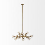 Add a touch of industrial design to your home with this Gold Metal Eighteen Bulb Hanging Chandelier. This hanging light is made from solid metal and has a very simple contemporary feel to it. There is one metal rod that runs down from the ceiling to the main body of this hanging chandelier. In the middle of the body there is a thick gold cylinder that has thin metal rods coming out of it. These rods have small bulb holders on the ends of them. The glass bulb shades also add to the industrial feel with small filament bulbs inside them which have a very bright yet diffused light. Elevate any space you want around your home with this hanging light. 16" H x 50.5" W x 50.5" D