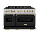 Luxury isn’t meant to be left desired—it’s meant to be attainable. The ZLINE Autograph Edition 48 in. 6.7 cu. ft. Classic Double Oven Dual Fuel Range with 8 Burner Gas Cooktop in Satin Stainless Steel with Black Matte Doors and Champagne Bronze Accents (CDRSZ-BLM-48-CB) combines the elegance of a hand-finished porcelain gas cooktop with 8 Italian-made auto-reignition burners, a large electric convection oven with an energy-efficient cooling fan to ensure quiet operation, a small bake-and-broil oven, beautiful black matte doors with Landscape window designs, and stunning champagne bronze knobs and handles allowing you to master every meal. With a modern, timeless style and refined functionality, ZLINE Classic Dual Fuel Ranges are masterfully crafted to deliver an elevated culinary experience.