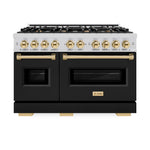 Luxury isn’t meant to be desired - it’s meant to be attainable. The ZLINE Autograph Edition 48 in. 6.7 cu. ft. Classic Double Oven Gas Range with 8 Burner Cooktop in Stainless Steel with Black Matte Doors and Polished Gold Accents (CGRZ-BLM-48-G) combines the elegance of a hand-finished porcelain gas cooktop with 8 Italian-made auto-reignition burners, a large gas convection oven with an energy-efficient cooling fan to ensure quiet operation, a small baking oven, beautiful black matte doors with Landscape window designs, and stunning polished gold knobs and handles allowing you to master every meal. With a modern, timeless style and refined functionality, ZLINE Classic Gas Ranges are masterfully crafted to deliver an elevated culinary experience.