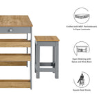 Discover the perfect addition to your kitchen with the Galley 3-Piece Kitchen Island Set. Made from durable particleboard, MDF, and paper laminate, this small kitchen island features a sleek, modern design with a beautiful wood grain finish. Offering a practical solution for meal preparation, this versatile kitchen island is ideal for casual dining. The Galley free-standing island includes a handy cutlery drawer and ample storage space in the open shelving on its base for kitchenwares and cooking essentials like spices, oils, vinegars, and wine bottles. Not only does this piece serve as a comprehensive kitchen island with storage but it offers extra prep counter space for meals and provides convenient seating with two stylish stools. Each stool has a square seat and stretcher footrests and is designed to complement this narrow kitchen island with comfortable seating. Crafted for versatility and practicality in any kitchen, all pieces come equipped with non-marking foot pads to protect your flooring. Elevate your kitchen's functionality and style with this freestanding kitchen island set. Set Includes: 1 Kitchen Island, 2 Stools. Island Weight Capacity: 205 lbs; Stool Weight Capacity: 500 lbs.