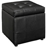The square shape evokes feelings of security and reliance in this compact accent ottoman you can count on. The Volt Button Tufted Faux Leather Upholstered Storage Ottoman stands ready as a footrest, while the lined storage compartment works great for both regular uses, and for a swift run-through before last-minute visitors. Dense foam padding and a solidly constructed wood frame are covered by soft and durable faux leather upholstery, while button tufting details give Volt a contrasting visual depth designed to please. Volt Faux Leather Upholstered Storage Ottoman features a boxy design that creates a dashing addition to your agile décor, making it perfect for your living room, lounge room, bedroom, or other seating areas.