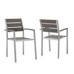 Enjoy your patio or backyard leisure time with the strong and durable Shore Outdoor Patio Aluminum Dining Armchair Set of 2. Made with an anodized brushed aluminum frame, sleek tube form, and non-marking black plastic foot caps, Shore Patio Armchairs feature tone-on-tone grays with wood accents on the paneling for a chic and minimalist look. This set complements your casual gatherings with a look and functionality that you can rely on.