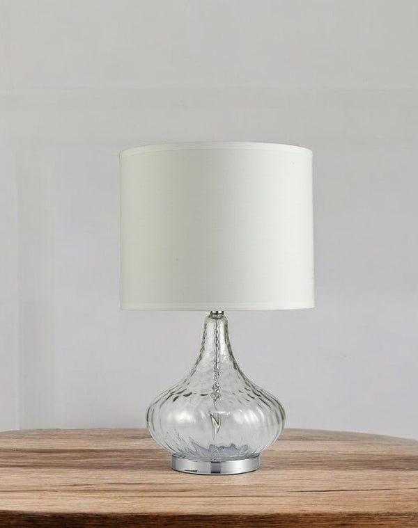 This Clear Textured Glass Table Lamp will make the perfect stylish light piece for any space in your home. This lamp has a simple round base that is made of silver metal. On top of this base, there are a wide urn shape made of glass. The glass is clear and has a textured effect on it. The glass is see through and allows the silver rod to show through a little bit creating a look of an illusion. The simple white fabric shade compliments the modern base and completes the overall look. You can use this lamp on its own or you can use a pair of these lamps to complete the look of your bedroom or living room. 24.5" H x 15" W x 15" D