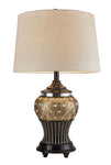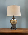 Turn on the glitz and glamour with this stylish Glitzy Gold Bejeweled Table Lamp. The high quality polyresin body with gold finishes makes for a sturdy lamp that will stand proud on any table or desk. The diamanté circles adorning the top of the base give a luxurious and glamourous look and feel, reflecting and glimmering from the light shining when the bulb is turned on, offering you a romantic atmosphere for your interior space. This vintage inspired polyresin table lamp adds lux and glam to your desk, workspace, bedside or table. 28.75" x 17" x 17"