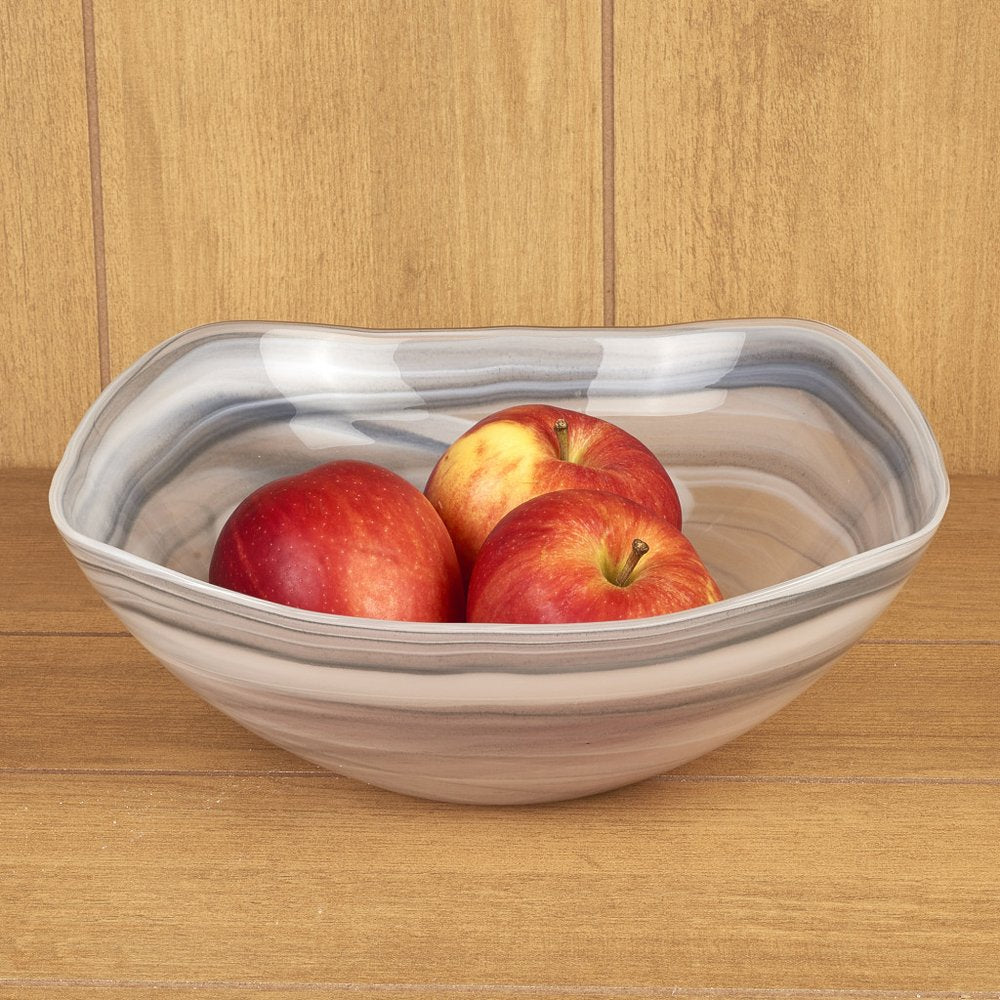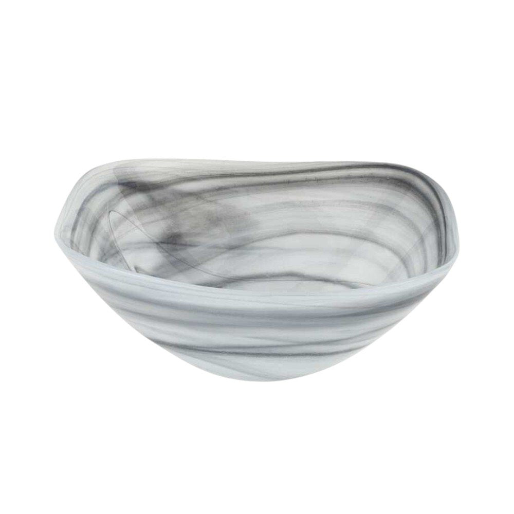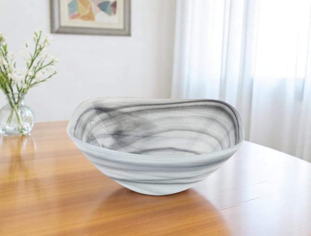 The 10-inch gray and white alabaster glass square salad bowl is a stunning addition to your space. This versatile bowl features a modern aesthetic with its milky charcoal gray and white color combination, making it an eye-catching centerpiece for any space. European handcrafted from high-quality alabaster glass, it showcases exceptional artistry and attention to detail. Designed in a soft corner square shape, it not only offers a generous capacity of 32 ounces but also enhances the presentation of whatever you choose to fill it with; or creates a striking decorative display on its own. 4-inch h x 10-inch w x 10-inch d.