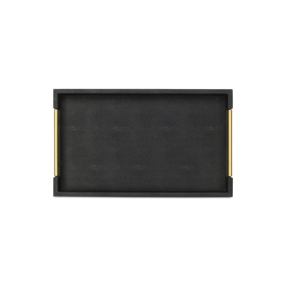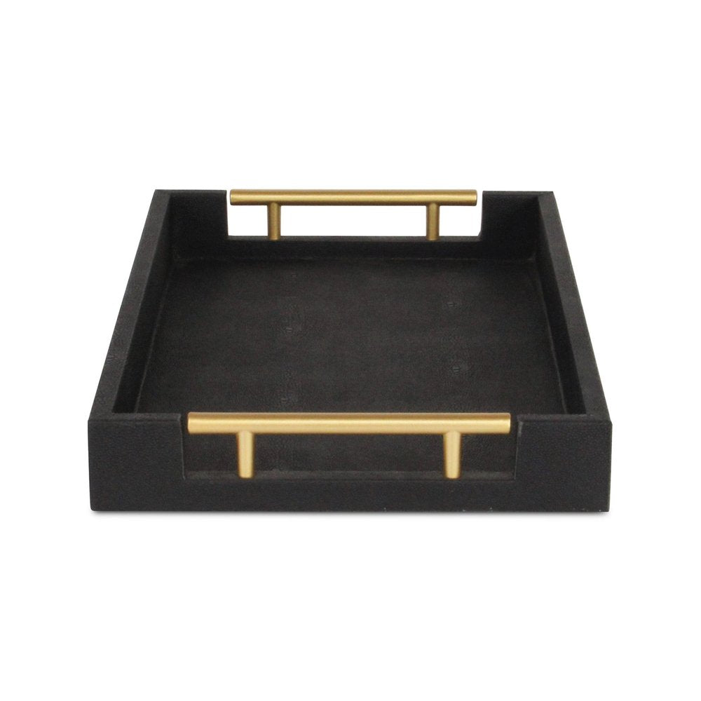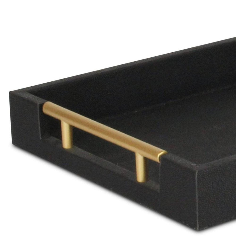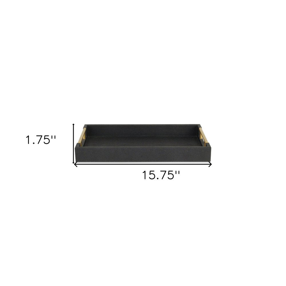 Freshen up your space with this convenient and good looking 16-inch black wood and vinyl faux shagreen serving tray with gold handles. Features tray level handles that aid in quick and easy transportation and storage. This decorative tray is great on it's own as decor, for serving, or for displaying a collection of candles, perfume, plants, and more. 1.75-inch H x 15.75-inch W x 9.5-inch D