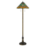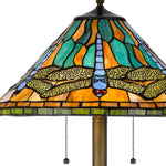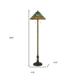 63" Brass Two Light Traditional Shaped Floor Lamp With Blue and Orange Dragonfly Tiffany Glass Empire Shade