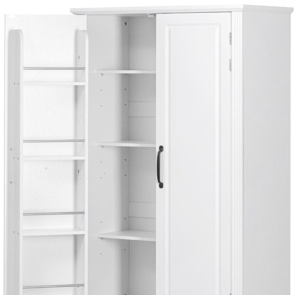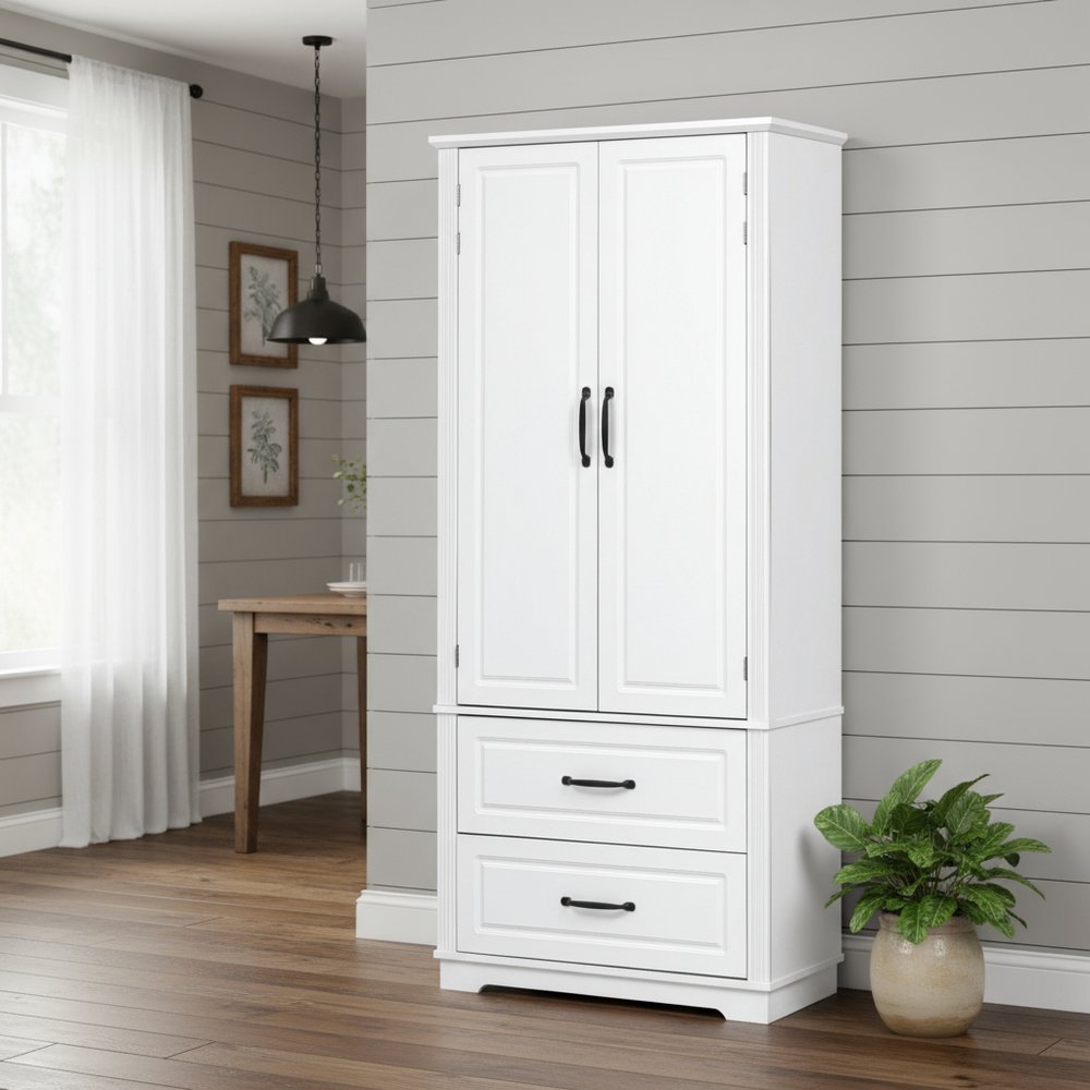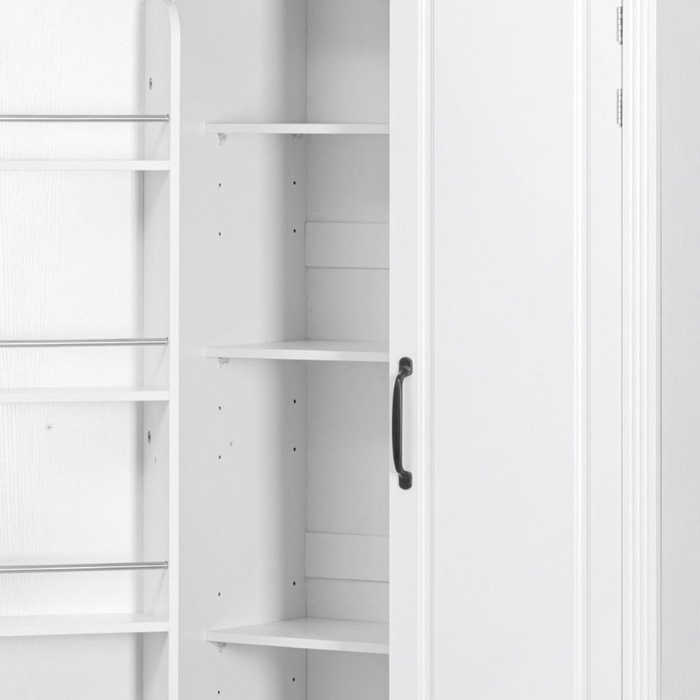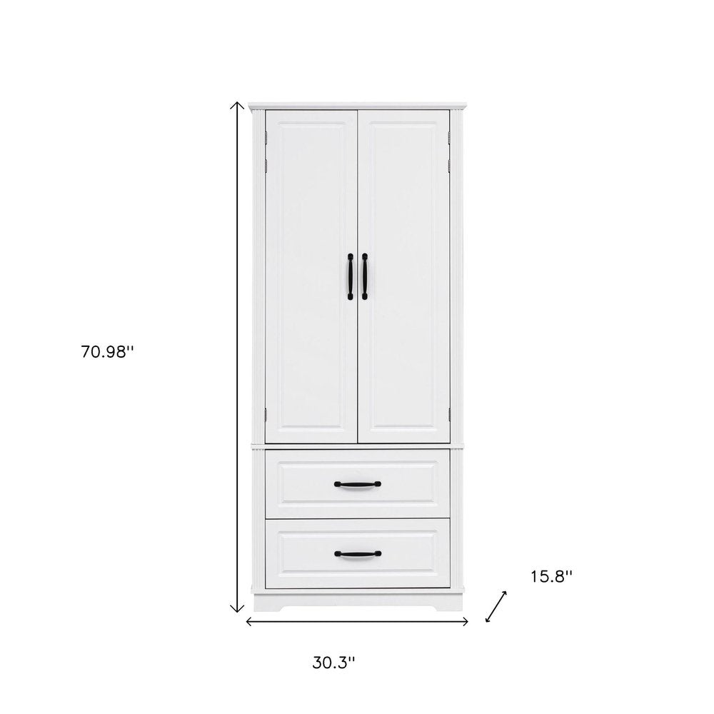 This 71-inch white wood pantry or storage closet is a practical and functional answer to your storage needs. Made from high-quality manufactured wood, this cabinet combines durability with a modern aesthetic. Its rustic white finish adds a touch of elegance to any kitchen or dining area, but this cabinet is versatile and be used in most any room. The raised panel door style enhances the modern design, making it visually appealing. With ample storage space, it helps keep your space clutter-free while providing easy access to your items. Elevate your home organization with this stylish and versatile furniture piece. 70.98-inch h x 30.30-inch w x 15.80-inch d.