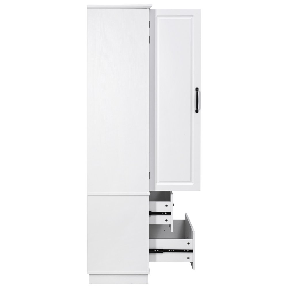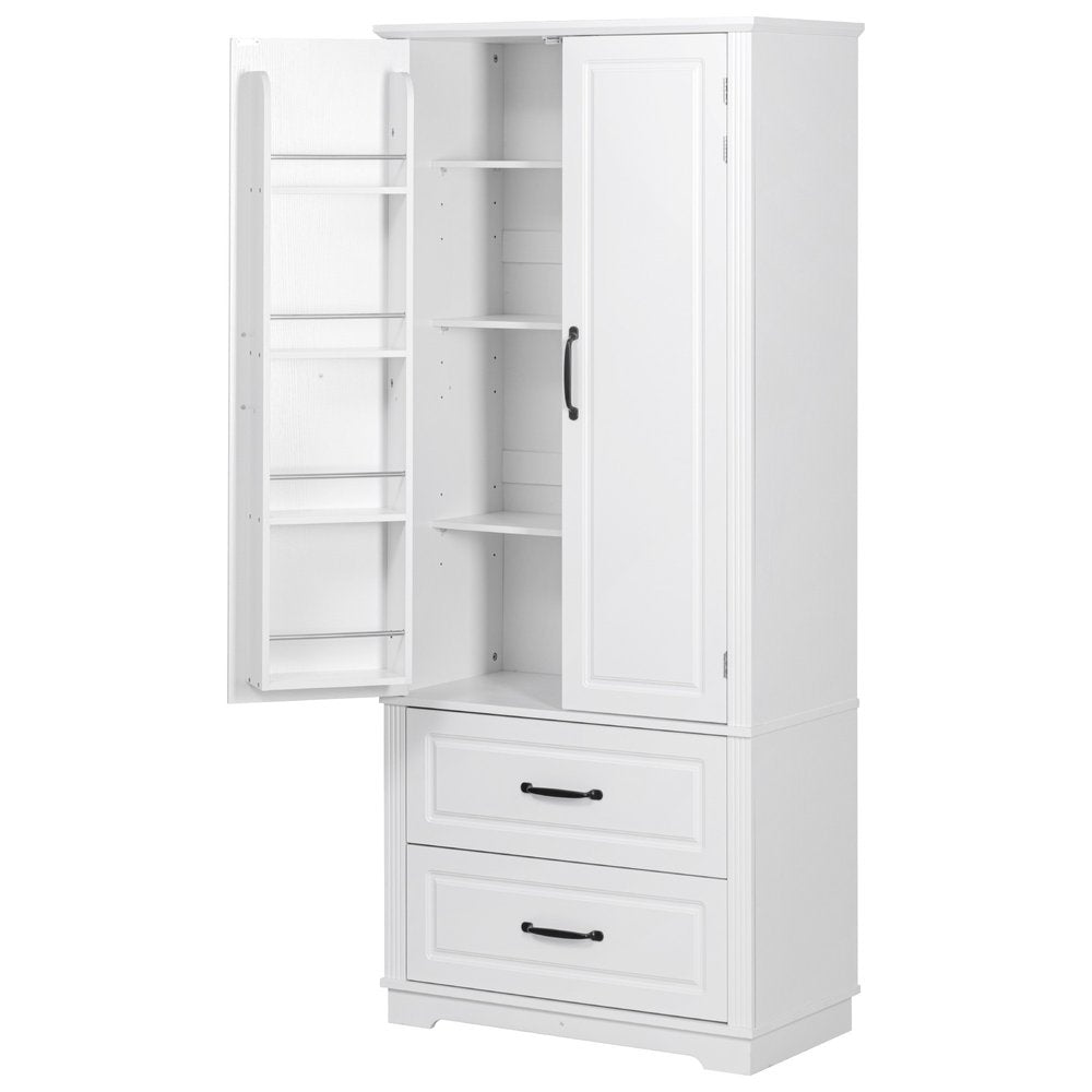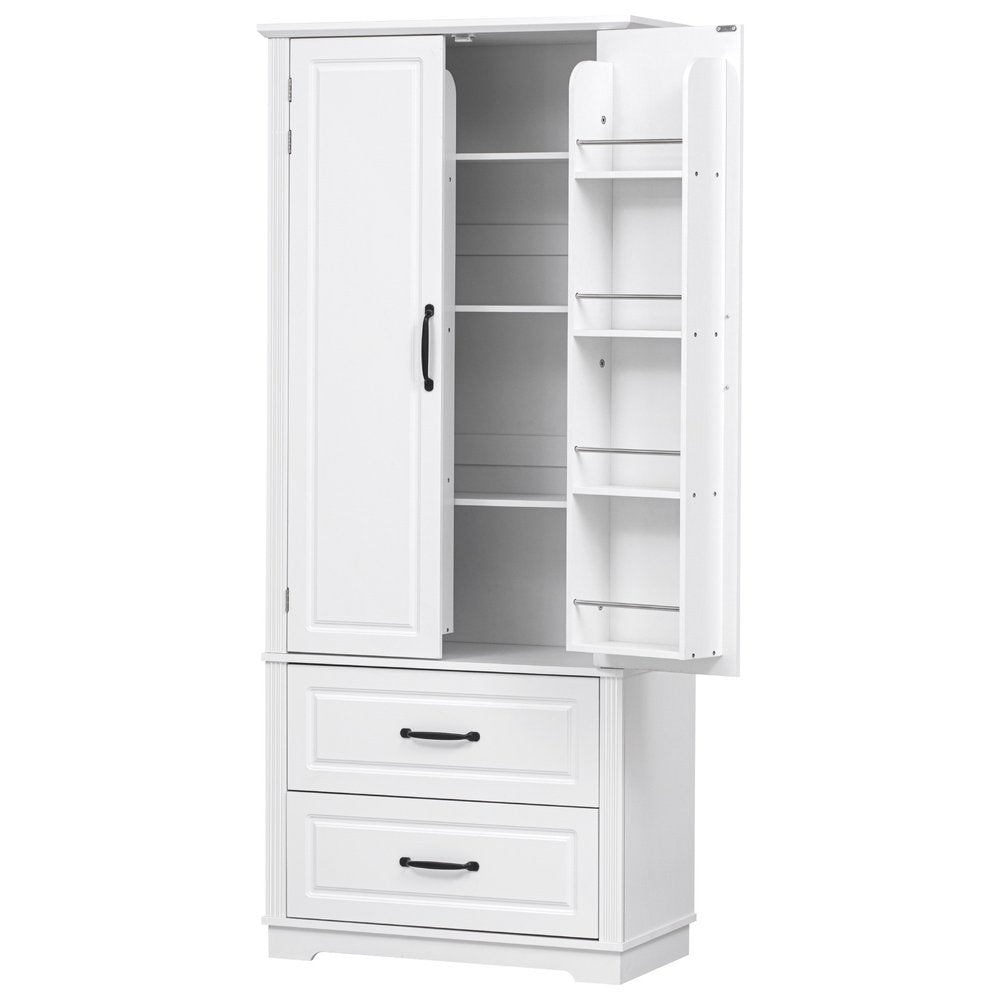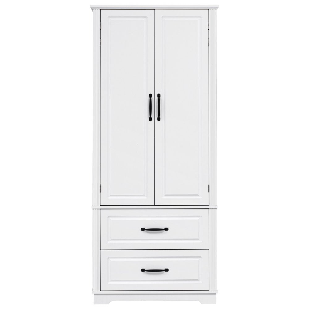 This 71-inch white wood pantry or storage closet is a practical and functional answer to your storage needs. Made from high-quality manufactured wood, this cabinet combines durability with a modern aesthetic. Its rustic white finish adds a touch of elegance to any kitchen or dining area, but this cabinet is versatile and be used in most any room. The raised panel door style enhances the modern design, making it visually appealing. With ample storage space, it helps keep your space clutter-free while providing easy access to your items. Elevate your home organization with this stylish and versatile furniture piece. 70.98-inch h x 30.30-inch w x 15.80-inch d.