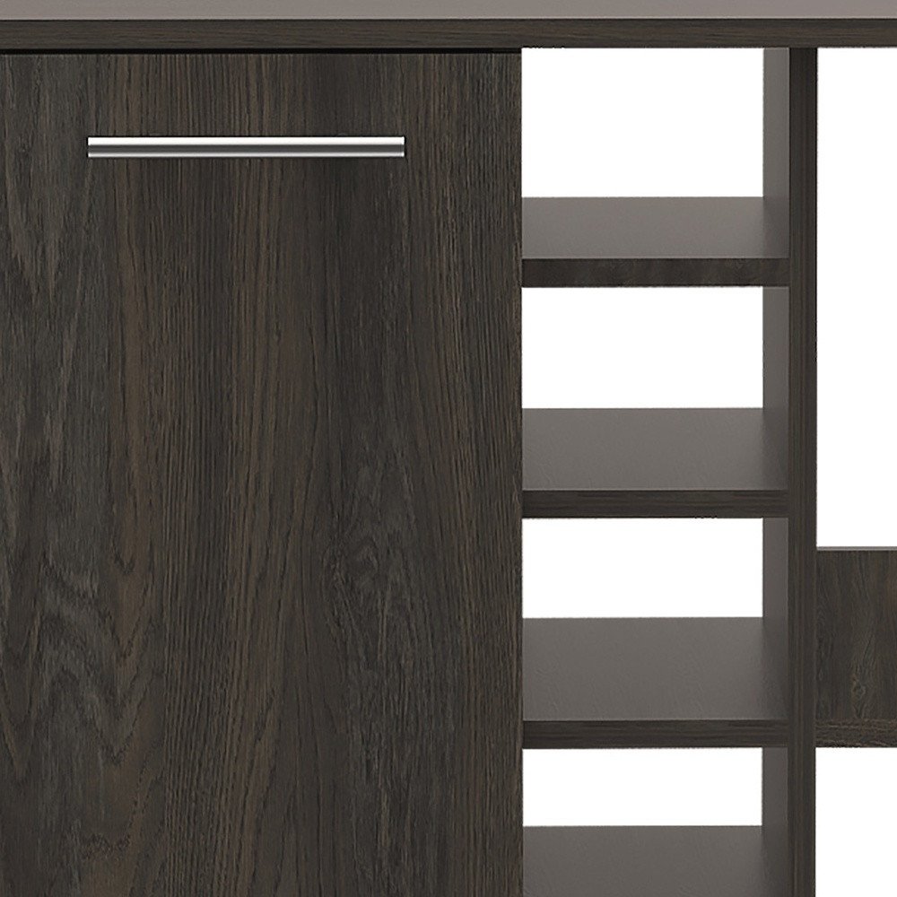 This espresso rolling bar cart with wine storage combines functionality and style. The freestanding cart is made of durable particle board with a sleek espresso finish. It features a cabinet with display stand, perfect for showcasing your favorite bottles, along with storage cabinets and shelves for all your bar essentials. The rectangular shape and contemporary design add a modern touch to any space. The cart is equipped with wheels, allowing for easy mobility. With a laminate top and a wine storage capacity of up to 6 bottles, this bar cart is ideal for entertaining guests or enjoying a quiet night at home. 32.4-inch H x 23.7-inch W x 14.8-inch D
