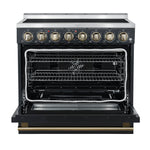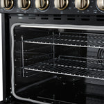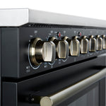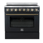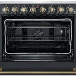 The Forno Paolo 36 Inch electric range in black with antique brass knobs and handles combines power and style for the modern kitchen. Its smooth ceramic glass cooktop features five...