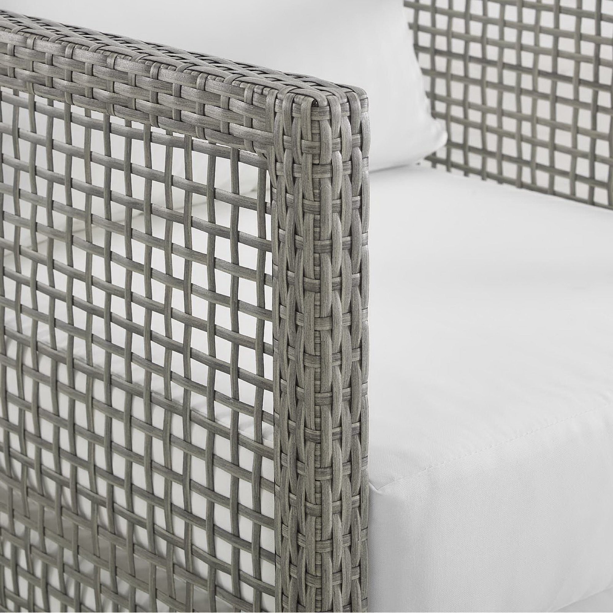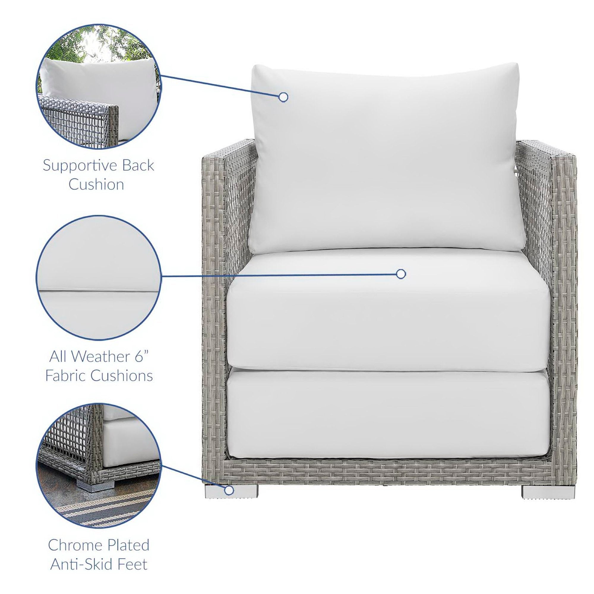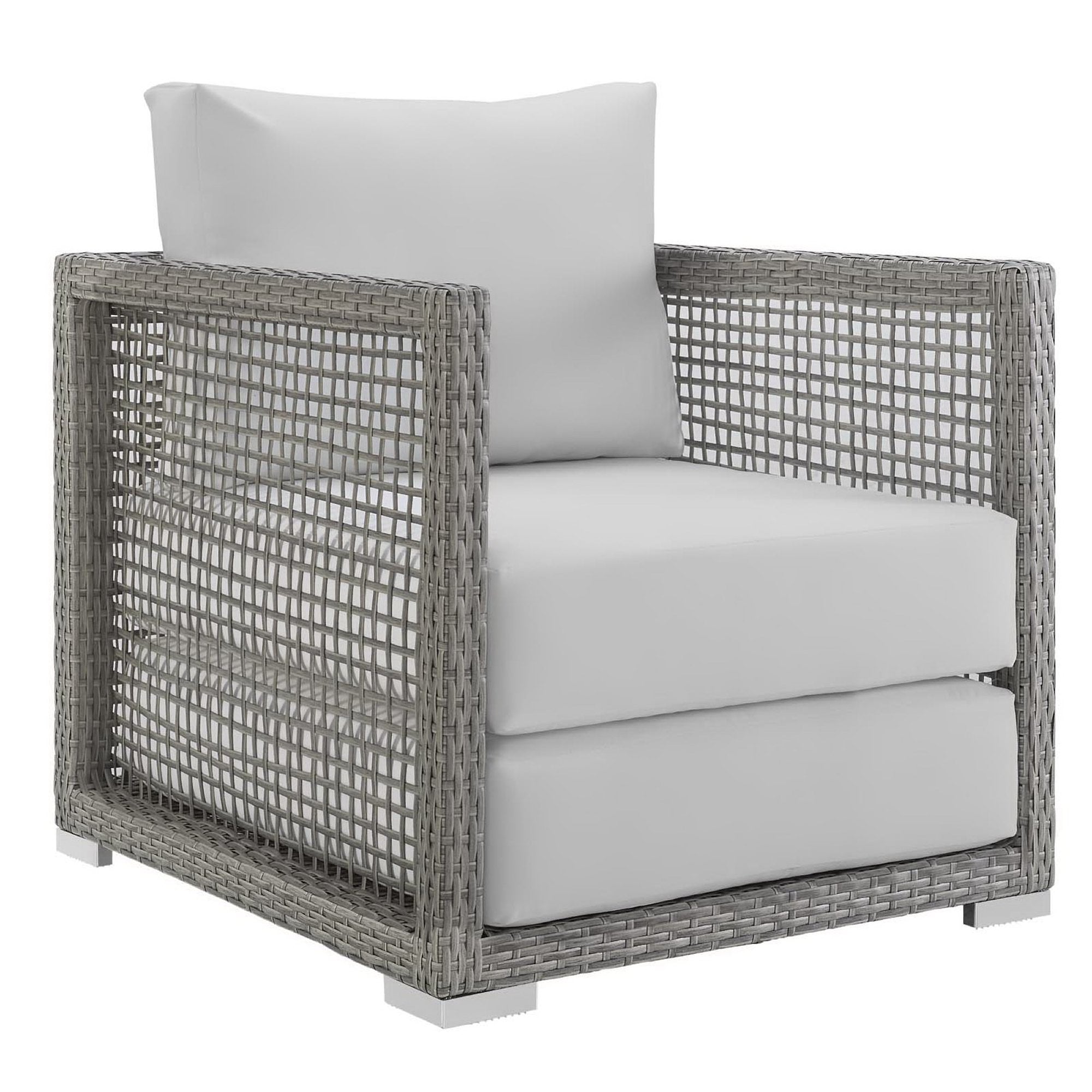 Weave conversational threads into a rollicking good time with Aura Outdoor Patio Armchair. Aura comes with a synthetic gray-on-gray tone wicker rattan weave and a powder-coated aluminum frame that delivers a softly versatile outdoor collection that shifts to meet the needs of the moment. Outfitted with machine washable and fade resistant all-weather fabric cushions, and designed with an extra wide and deep body, Aura will make your outdoor spot the focal point of good memories and festive gatherings while enhancing your patio, backyard or poolside arena. Featuring thick cushions and chrome plated anti-skid feet, enjoy spacious seating and enhanced comfort with this reliable piece of outdoor furniture. Comes fully assembled.