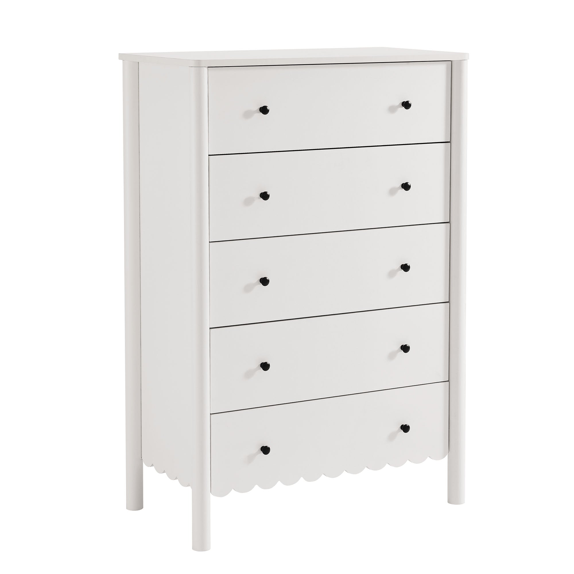 An elegant blend of subtle curves and practical storage, the Emmeline 5-Drawer Chest brings a touch of artistic flair to any room. Its standout feature—a scalloped edge design—creates a soft, flowing silhouette that enhances the modern simplicity of the design. With five spacious full-glide drawers, this chest of drawers offers flexible storage space, ideal for organizing clothing, bedroom essentials, linens, and more. Crafted with a sturdy frame and finished in smooth laminate, this versatile 51-inch tall dresser is as functional as it is stylish. The round drawer knobs and non-marking glides add to its refined appearance, while ensuring your floors remain protected. Whether serving as a modern bedroom dresser or living room organizer, the Emmeline 5-Drawer Chest adds a contemporary, polished look to any space. Assembly required.