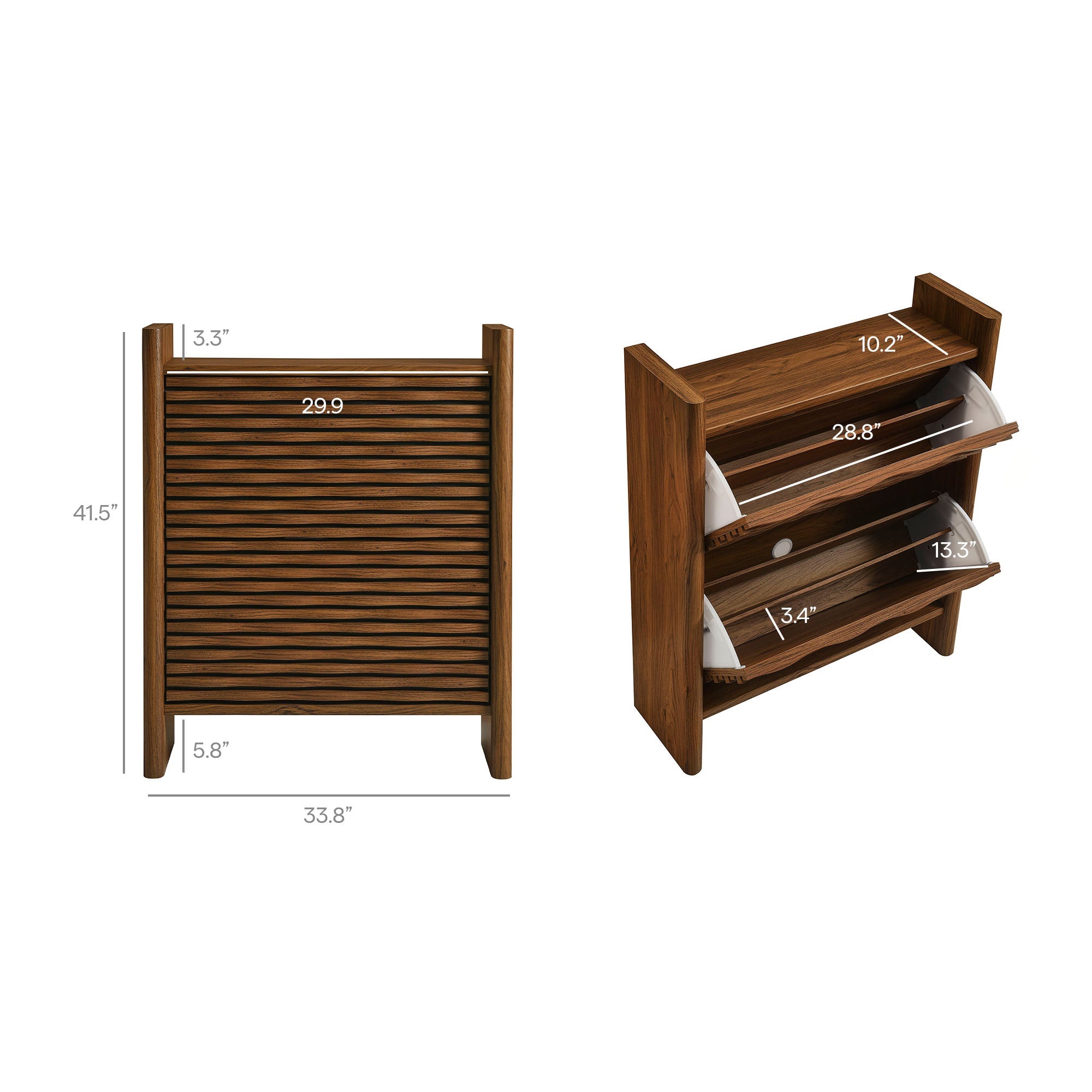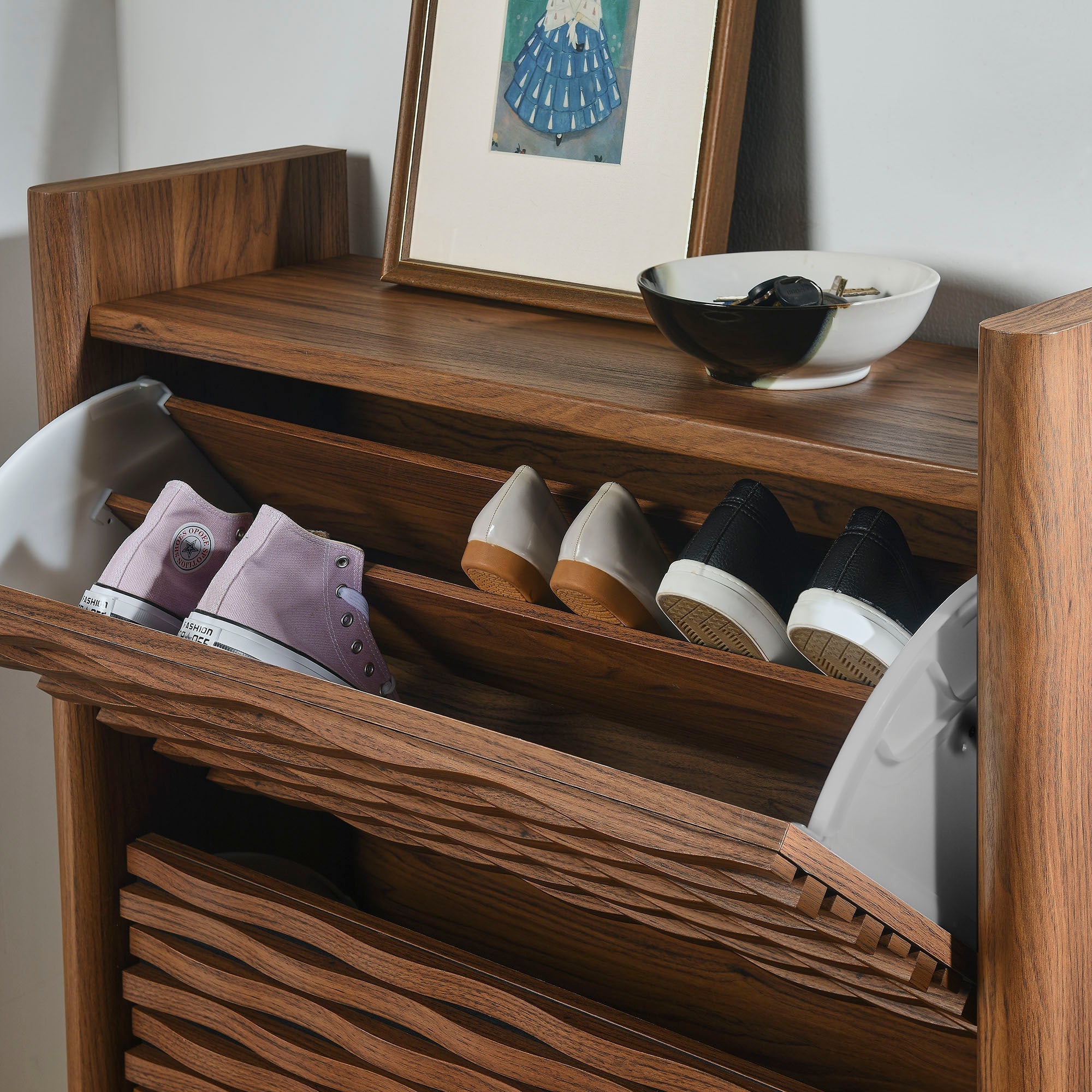 Simple in purpose, the Emric Wave Shoe Cabinet brings a soft, sculpted feel to functional storage. Made from a wood blend with a beautiful wood grain finish, this shoe storage cabinet features slatted fronts with a subtle wave design resting on a black backdrop that adds depth and movement. Two pull-down drawers swivel open to reveal hidden compartments, ideal for neatly storing shoes and keeping entryways or hallways clutter-free. With thick side panels that extend to the floor, this narrow shoe storage cabinet rests on a solid base that feels grounded from every angle. Whether styled as a shoe cabinet with flip-down storage for the entryway, or a compact vertical shoe organizer in a hallway, this contemporary shoe rack cabinet brings character and convenience to any space. Includes non-marking foot glides for floor protection. Assembly required.
