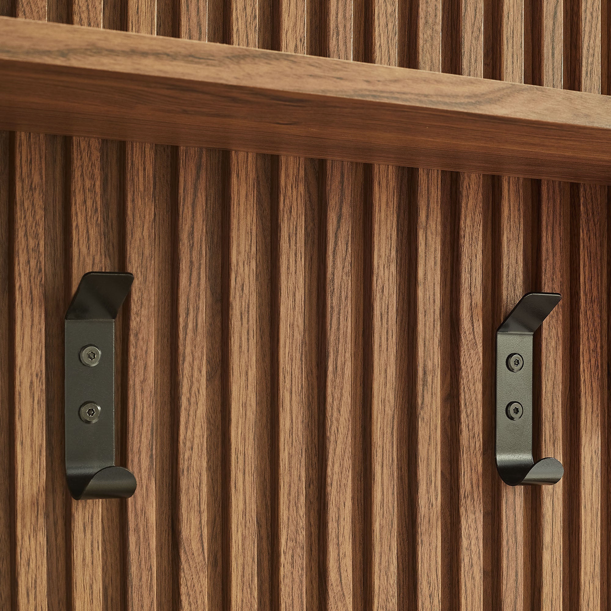 Tap into mid-century aesthetics with the Render Wall Coat Rack Panel. Designed with a vertical fluted detail in a warm wood grain finish, this modern slatted wood coat rack with shelf offers a decorative yet functional solution for organizing outerwear and accessories. The wall-mounted coat rack panel features four sturdy hooks for coats, hats, and bags, paired with a spacious top shelf for displaying decor or storing small essentials. Ideal for hallways, mudrooms, or foyers, this vertical slat wall panel with hooks saves floor space while adding a refined, architectural touch. Crafted from durable particleboard with a smooth wood grain laminate, Render combines style and function in one versatile piece. Assembly required.