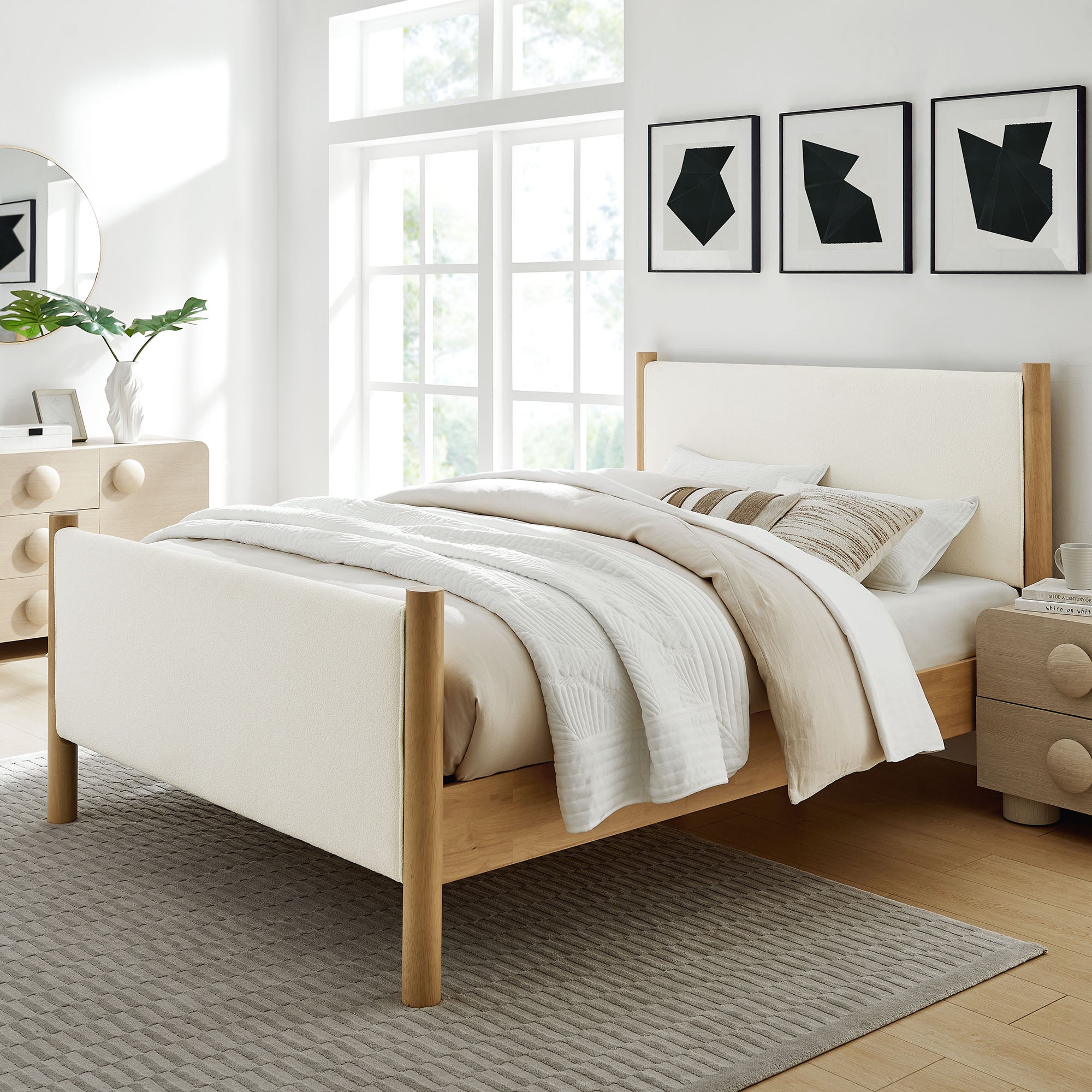 Blending cozy texture with craftsmanship, the Maven Queen Size Platform Bed is a stylish focal point for any bedroom. Upholstered in soft boucle fabric, the headboard and footboard provide a warm, inviting backdrop framed by sturdy solid wood posts for a touch of timeless elegance. This queen bed frame is designed with wooden slats that support your mattress while allowing airflow, eliminating the need for a box spring. Perfect for primary bedrooms, guest rooms, or any space seeking added comfort and contemporary design, the Maven Boucle Queen Bed delivers both durability and style. Weight Capacity: 794 lbs.