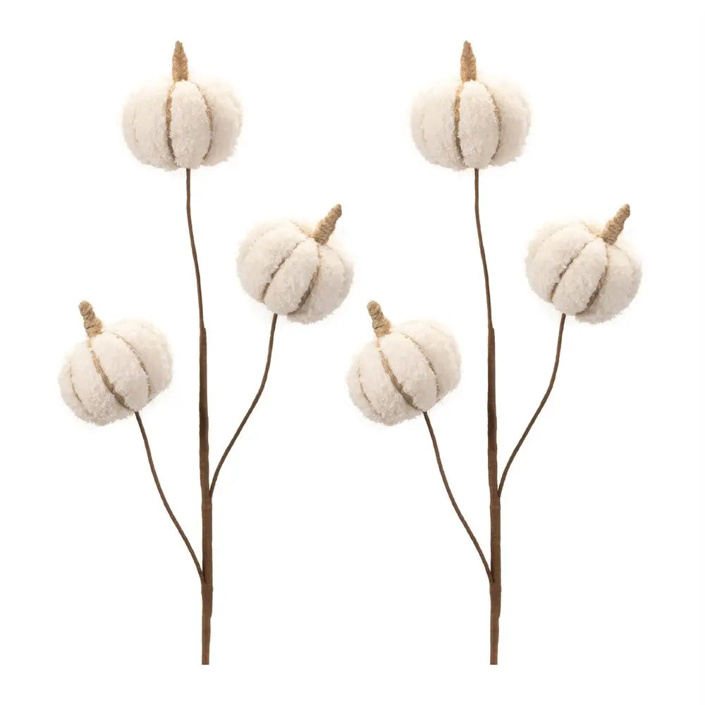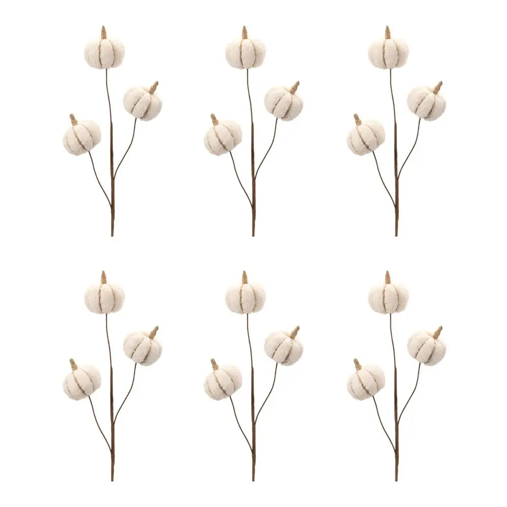 These charming wreath sprays features delightful pumpkin accents that add a playful touch to your decor. Perfect for brightening up your indoor spaces, these versatile pieces can be used to create floral arrangements, decorate a a wreath, or use as part of a garland strand. The adorable soft textured pumpkins on a bendable stem will help to create a festive fall look. Each set includes six individual pieces, with three pumpkins on each, allowing you to create your own unique arrangements.